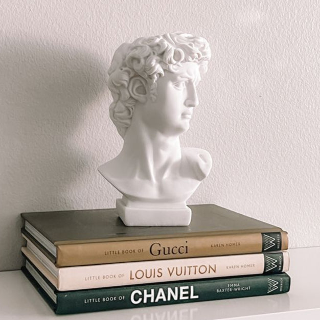 Inspirado en la icónica escultura de Miguel Ángel, esta figura decorativa representa el personaje bíblico David, joven valiente que se enfrentó al gigante Goliat. Elaborada artesanalmente en yeso blanco con acabado condurado, esta pieza de 15 cm de alto por 12 cm de ancho es un homenaje al arte clásico y la fuerza interior.